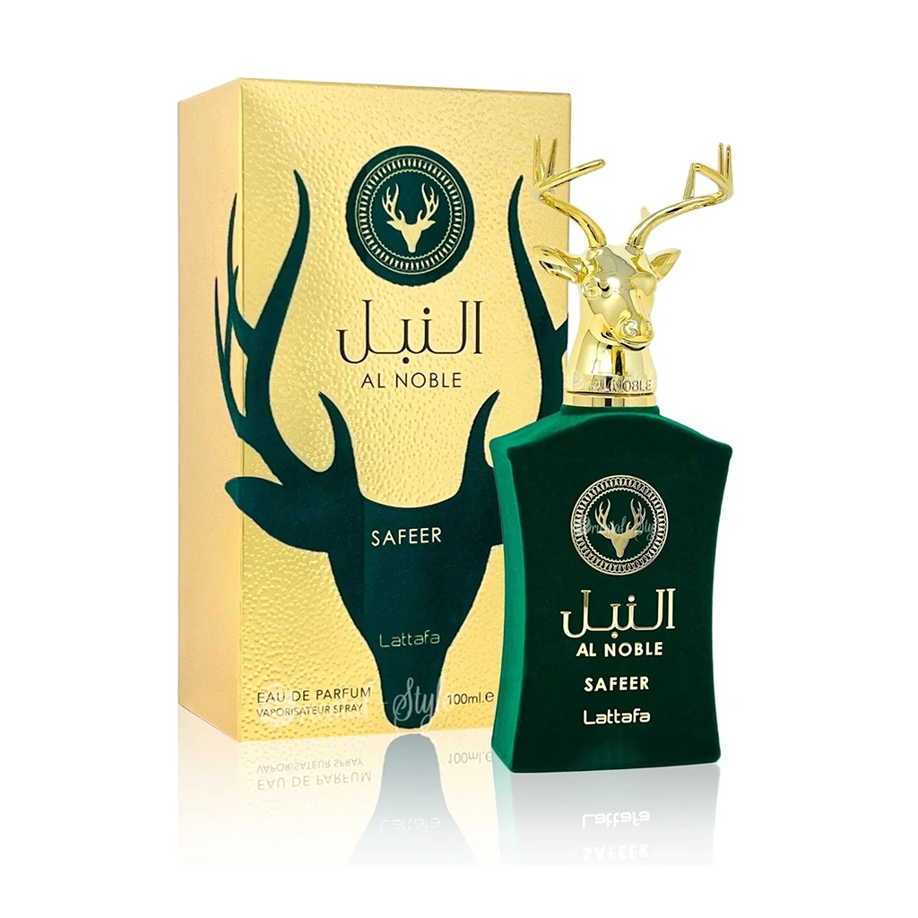 Lattafa Al Noble Safeer is a unisex Eau de Parfum (100ml) known for its distinct green, herbal, and woody profile. Part of the Al Noble collection, it is often recognized for its striking velvet-textured green bottle topped with a signature golden deer head cap.