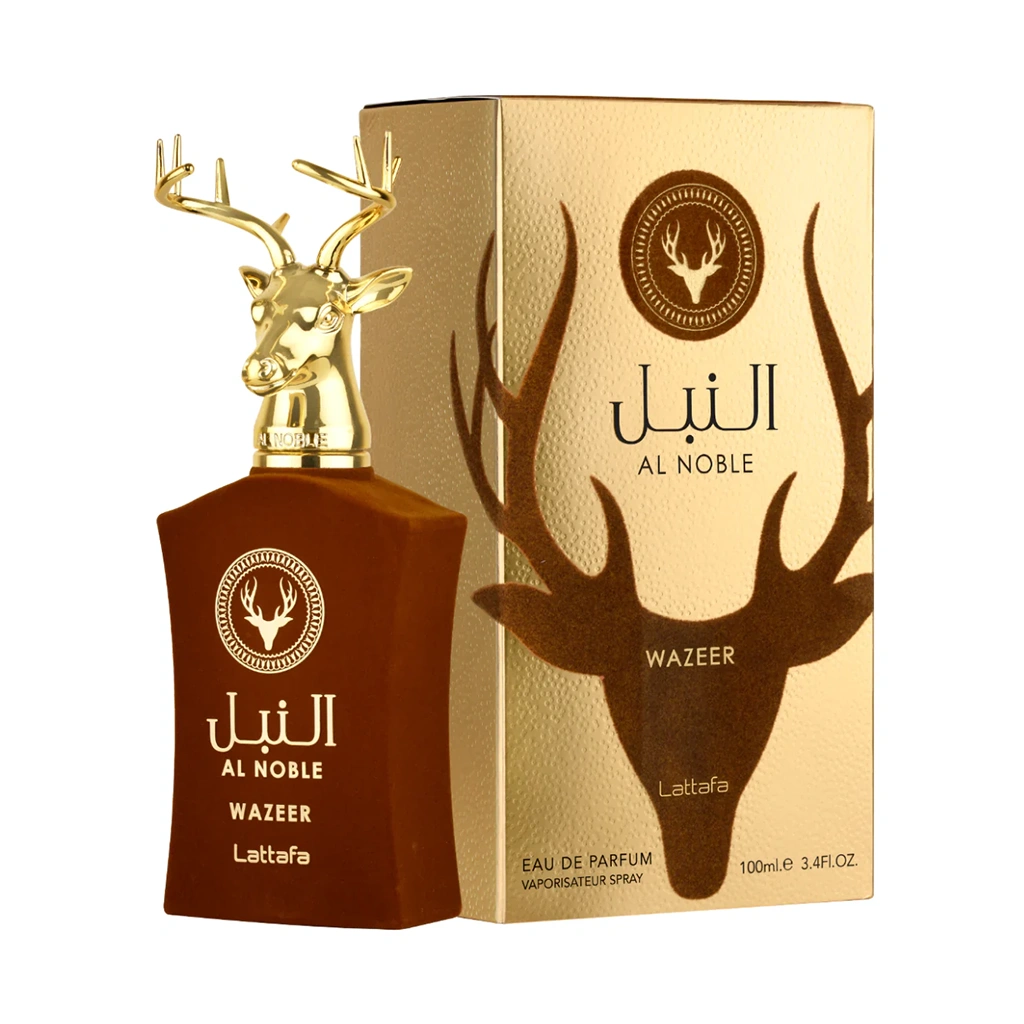 Al Noble Wazeer by Lattafa is a 100ml unisex Eau de Parfum featuring a fruity-woody, powdery scent profile with notable notes of mint, dark chocolate, and amber. Known for its elegant packaging and long-lasting, versatile aroma, it is often considered a great value fragrance for daily or special wear.