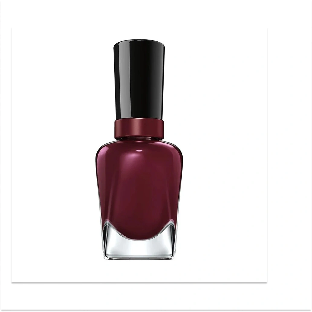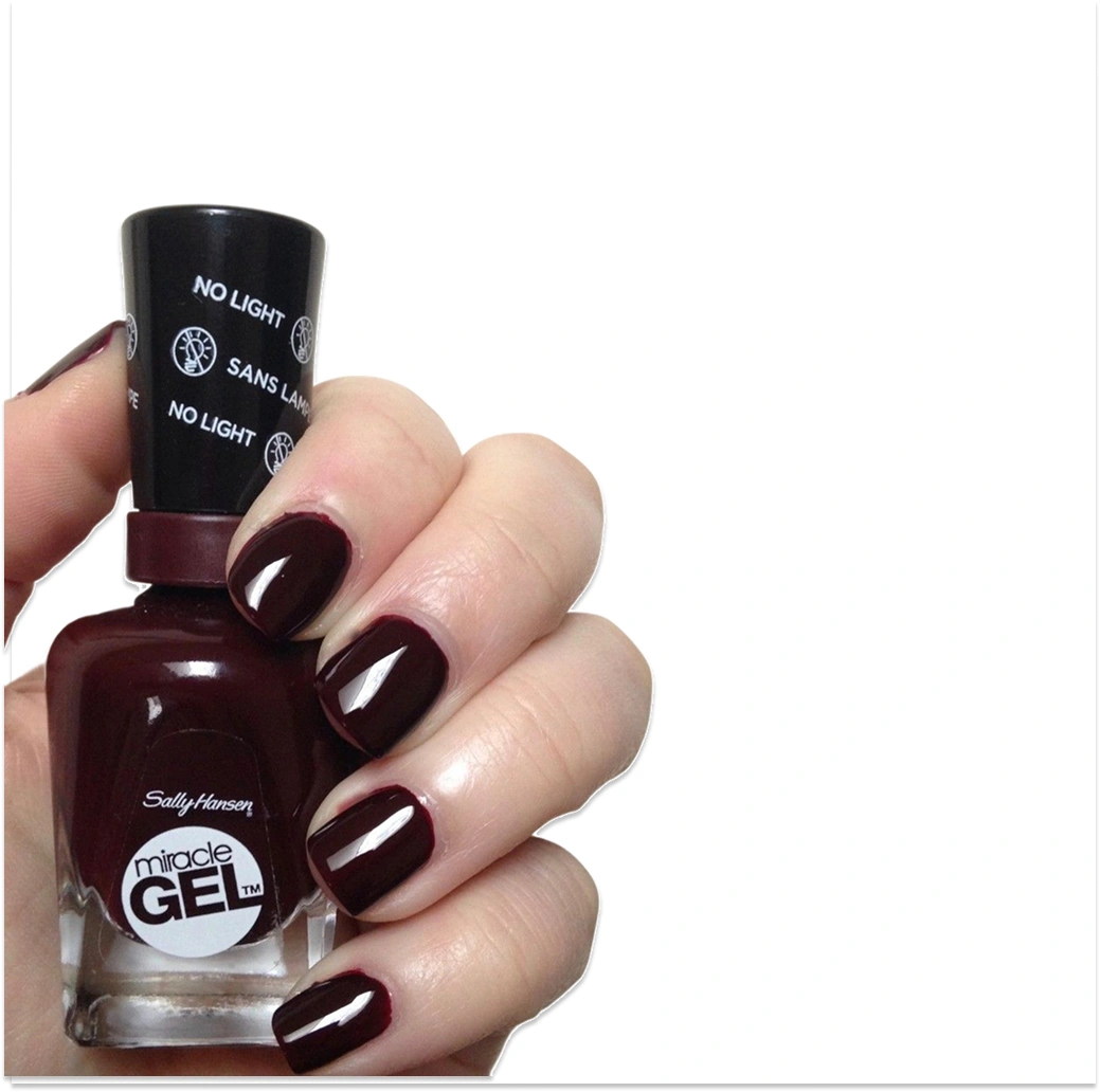 Sally Hansen Miracle Gel Wine Stock (#480) is a deep, sophisticated dark burgundy with rich red and black undertones. This "gel hybrid" polish provides a high-shine, salon-quality finish without requiring a UV or LED lamp for curing.