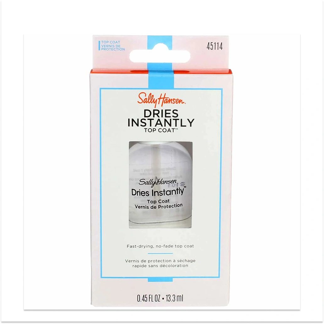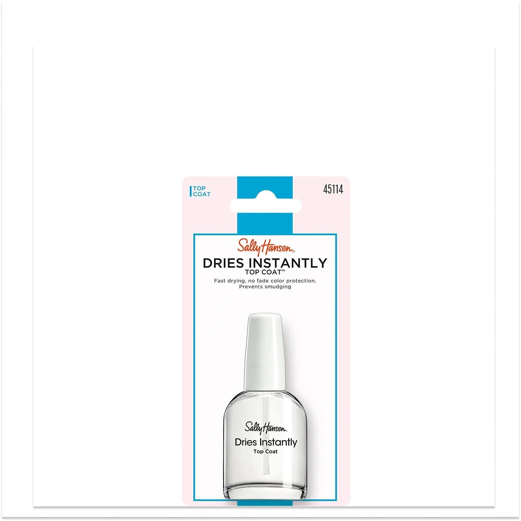 Sally Hansen Dries Instantly Top Coat (item #45114) is a fast-drying, high-shine treatment enamel designed to seal nail color quickly and prevent smudging or chipping.